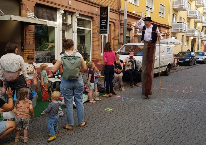 Die offizielle Spielstraße Kronenstraße wird an diesem Nachmittag mal wirklich zum Spielen genutzt: Fußballspielen, Seilspringen, Roller fahren. Lastenkarle bietet Probefahrten an, NABU, Schwarzwaldverein, VCD und BUZO informieren über ihre Arbeit. Ein Anwohner begeistert das Publikum als Stelzenmann, ein sehr schön gestalteter und begrünter Hinterhof kann besichtigt werden. Kurzum, es ist wieder eine gelungene Aktion, wir freuen uns schon auf den Park(ing) Day 2026 und hoffen, dass bis dahin die Kronenstraße auch im Alltag ein wenig mehr von kleinen und großen Fußgänger*innen genutzt wird.